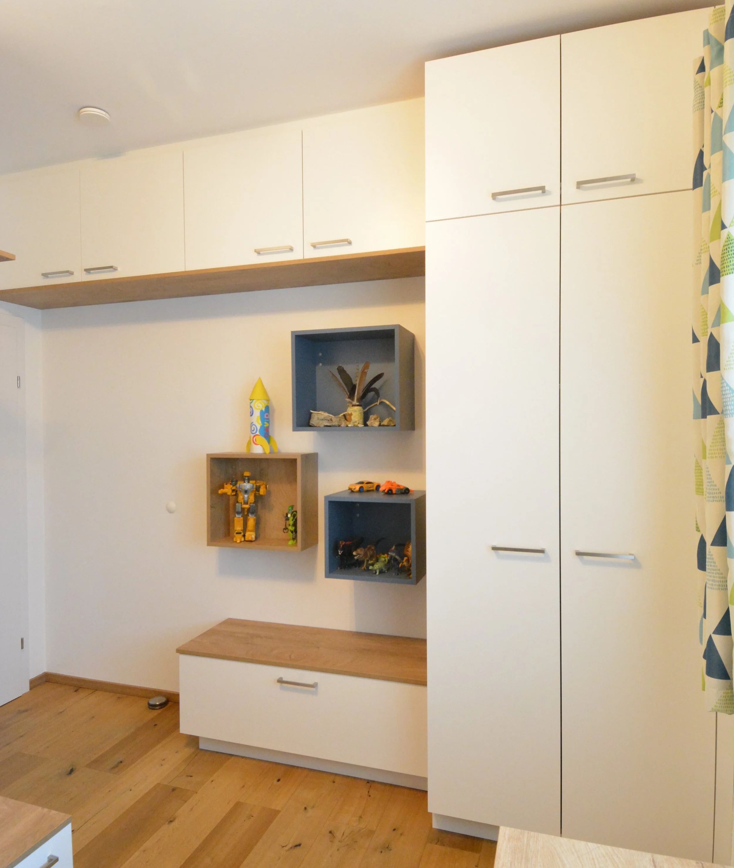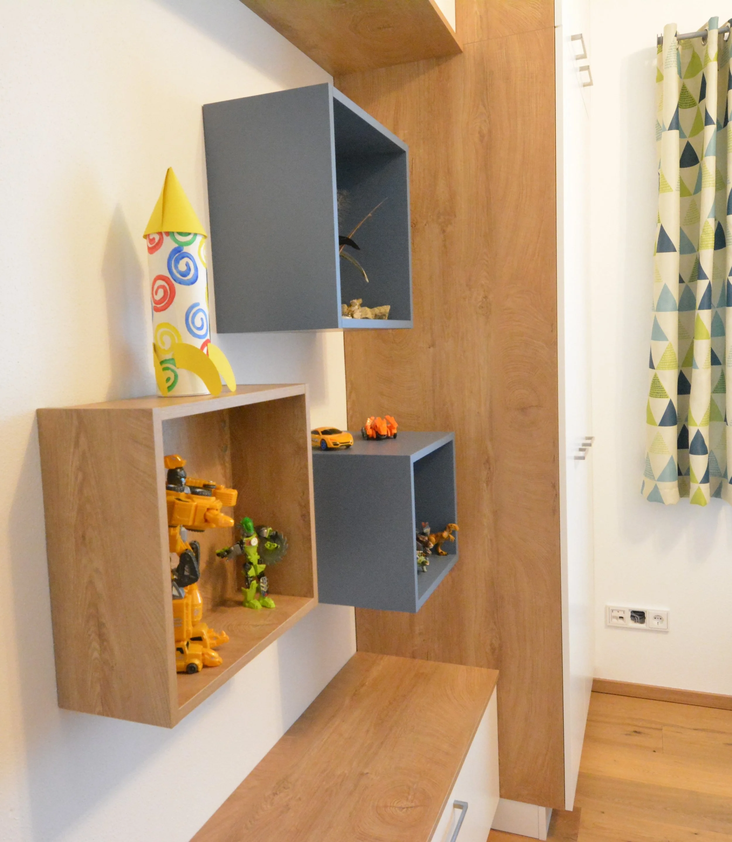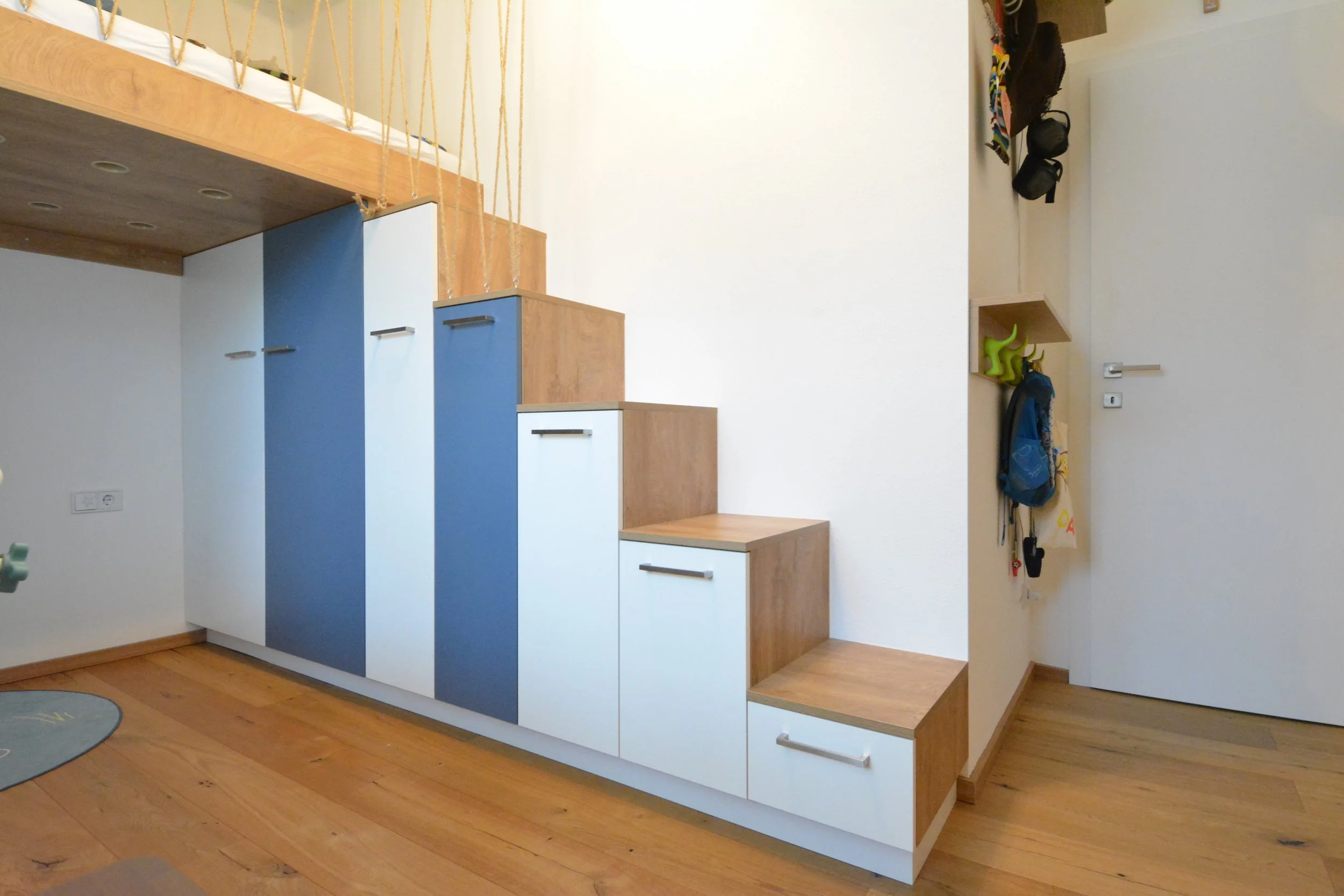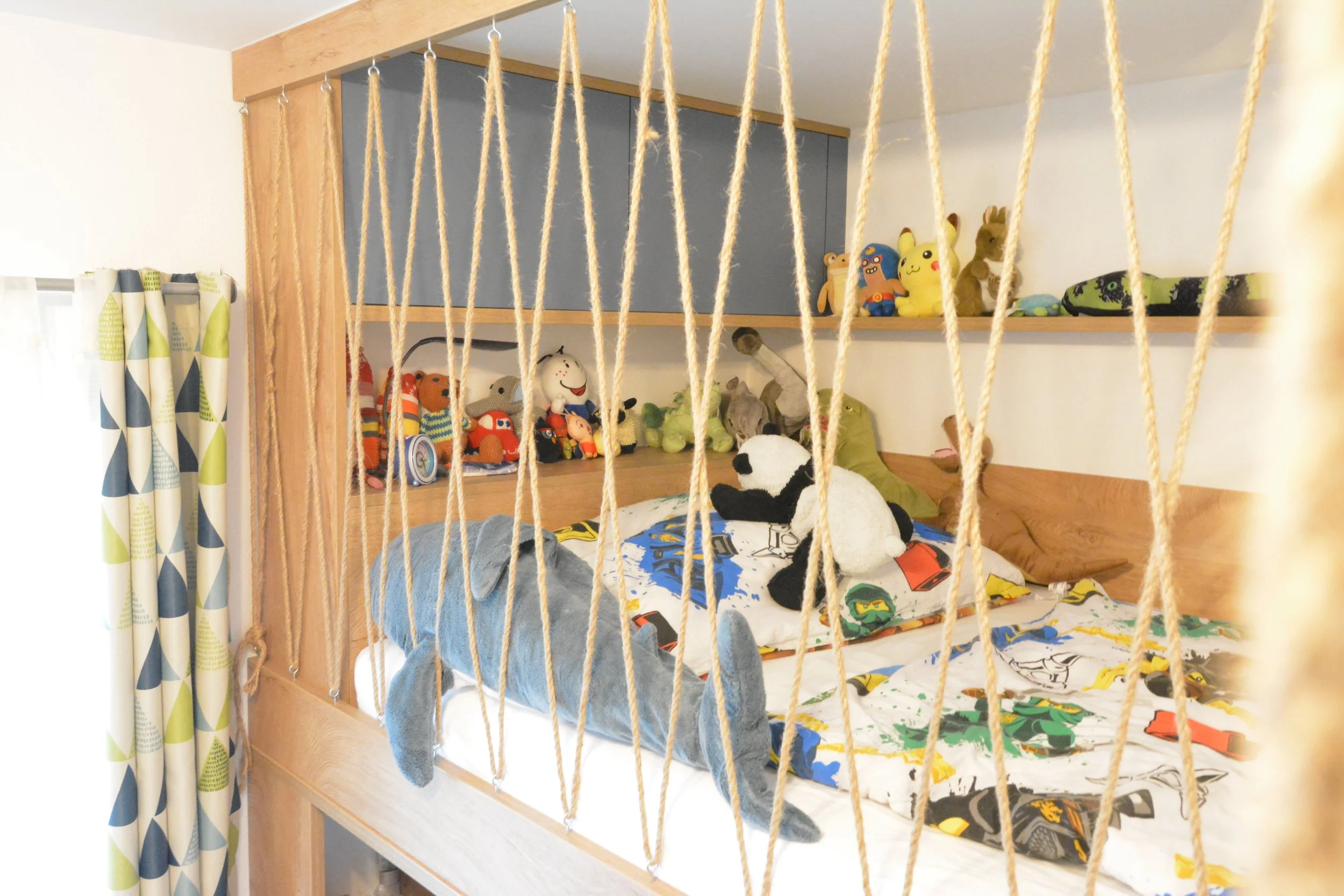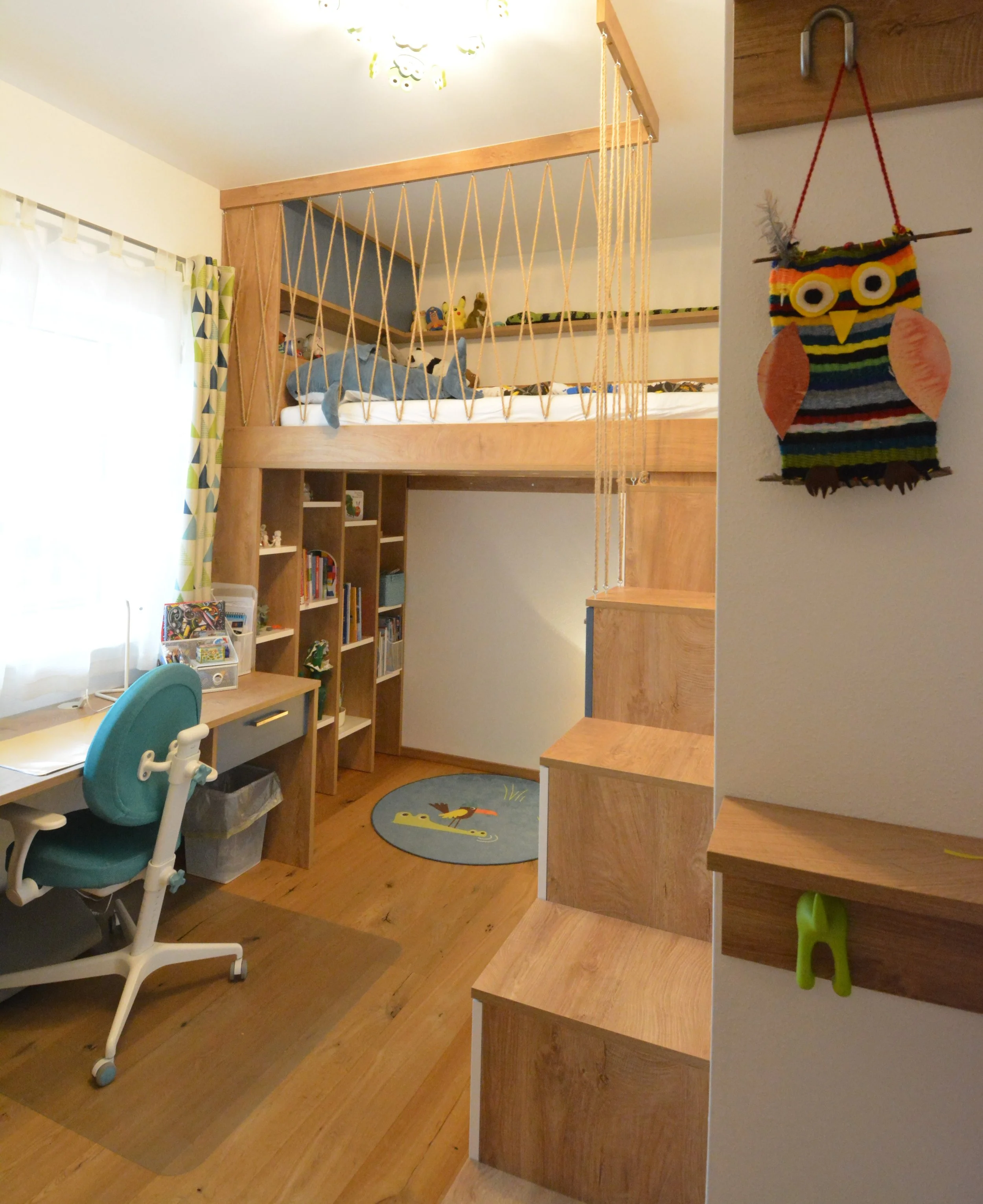 wollte ein kleiner Mann in seinem Kinderzimmer. Durch das Hochbett konnten wir mehr Platz im Zimmer gewinnen.