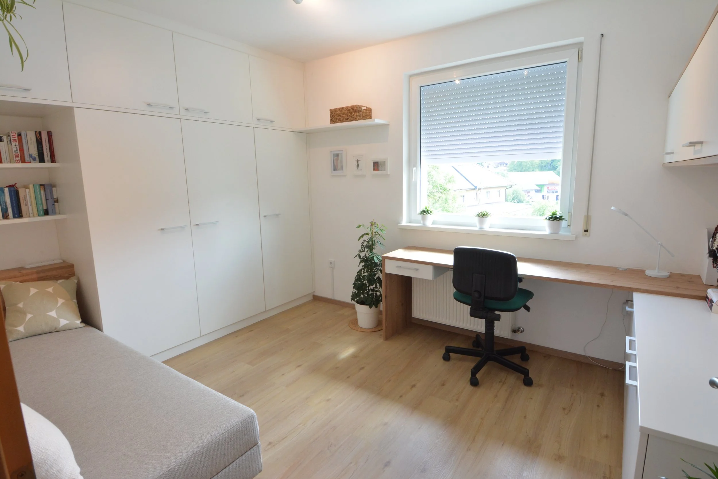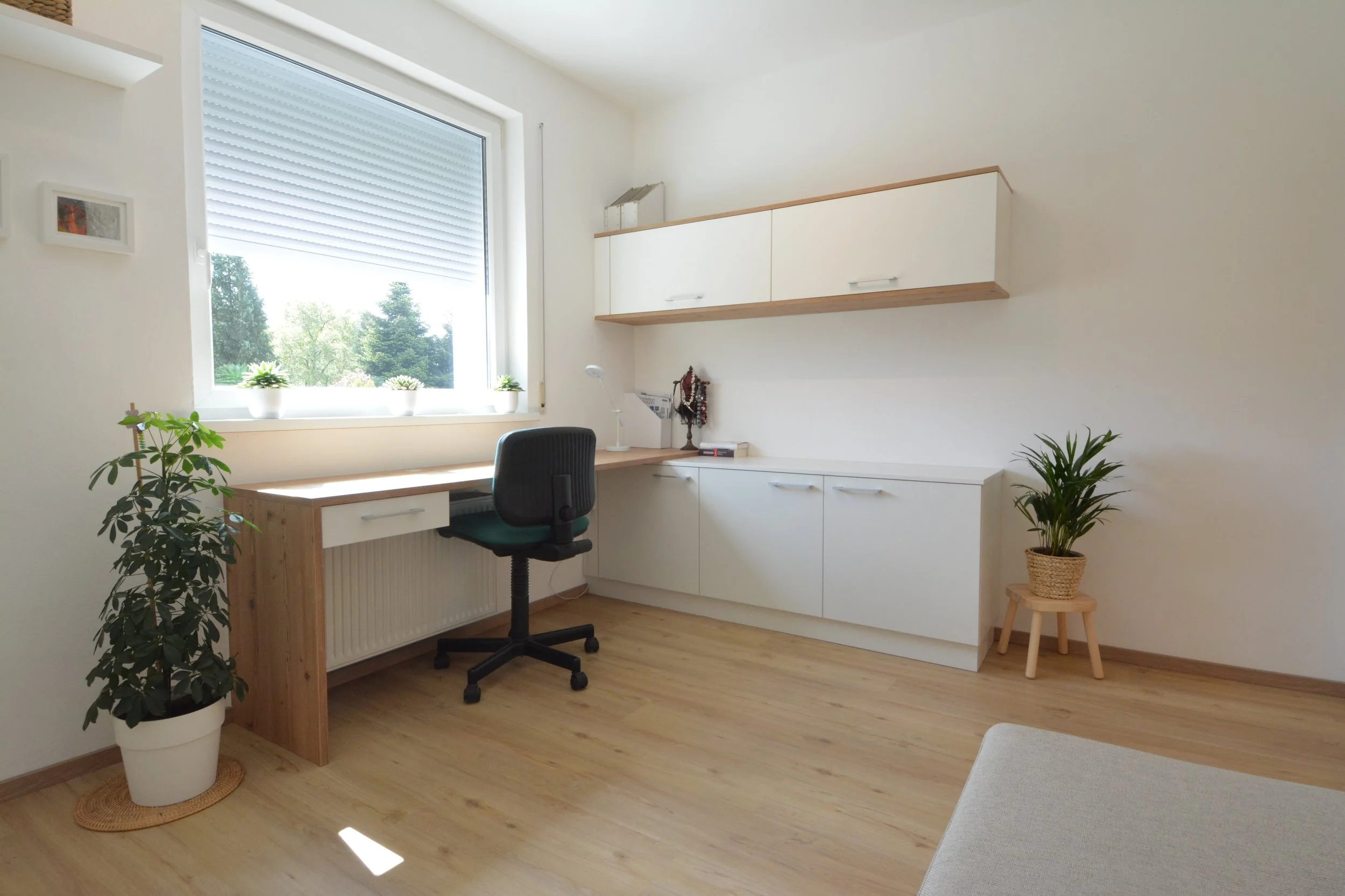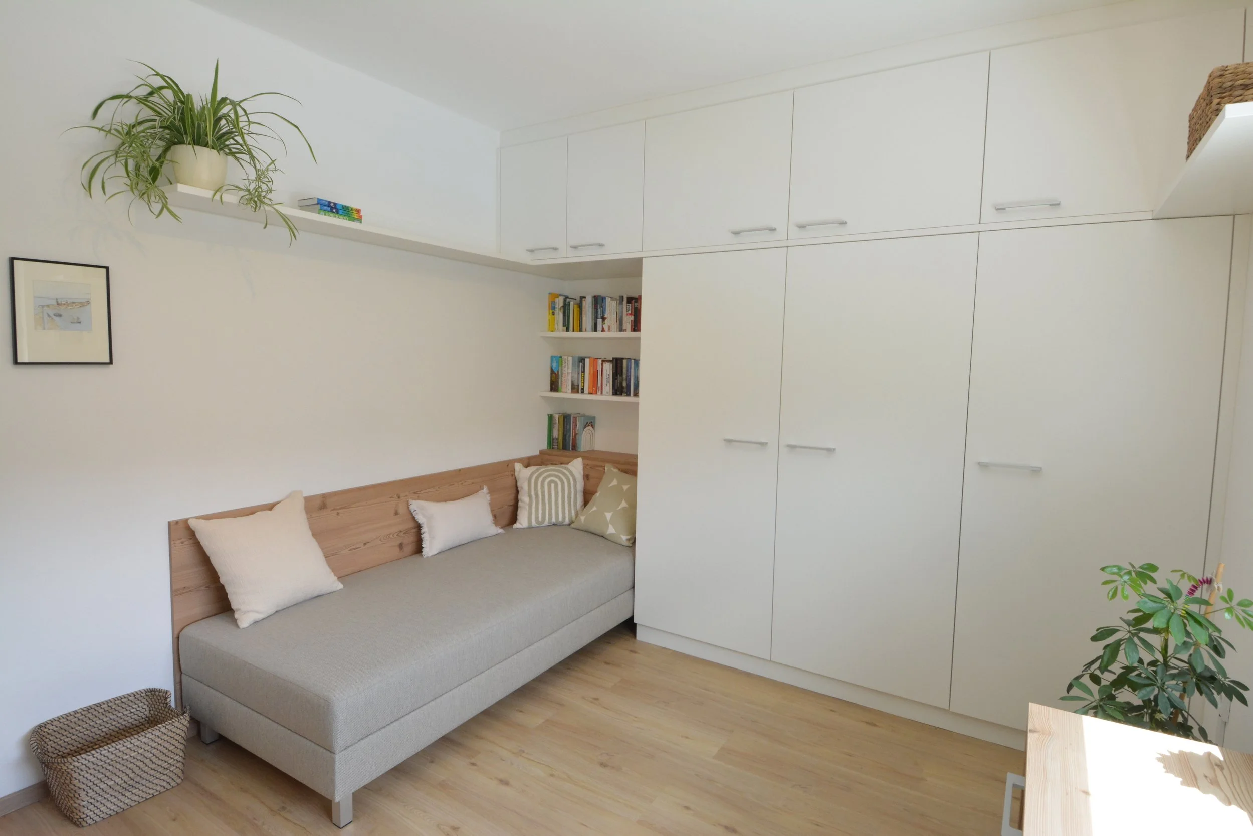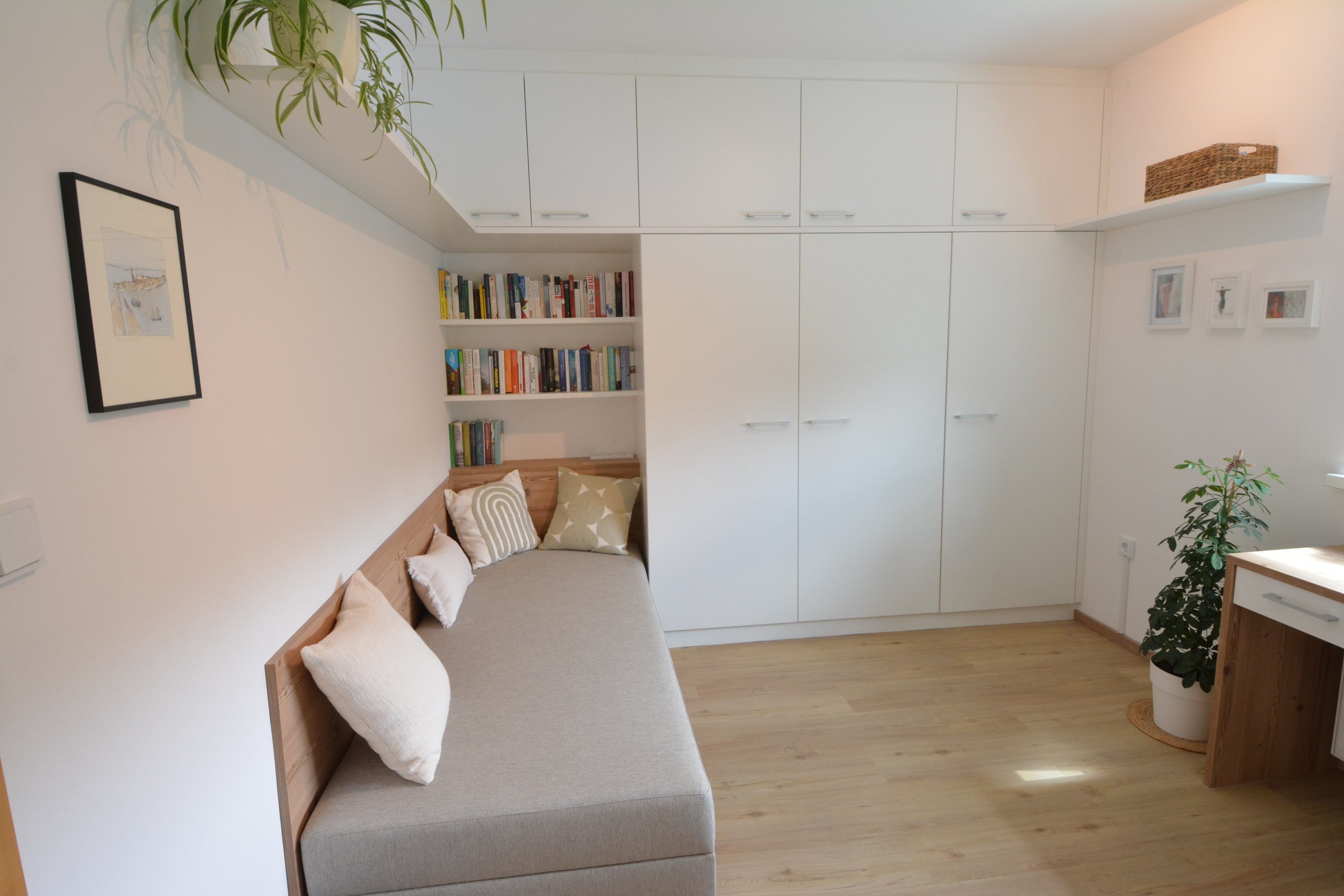 Ein ehemaliges Kinderzimmer wurde umfunktioniert zu einem gemütlichen Rückzugsort mit einem kleinen Bürobereich und viel Stauraum für Bücher, Kleidung,…
