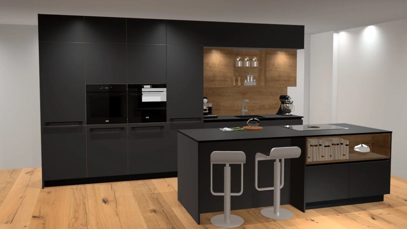 …aus einer schwarzen matten Oberfläche und “wilder” Eiche. Damit dem Raum, in Zusammenarbeit mit dem Holzboden, etwas Lebendigkeit eingehaucht wird.