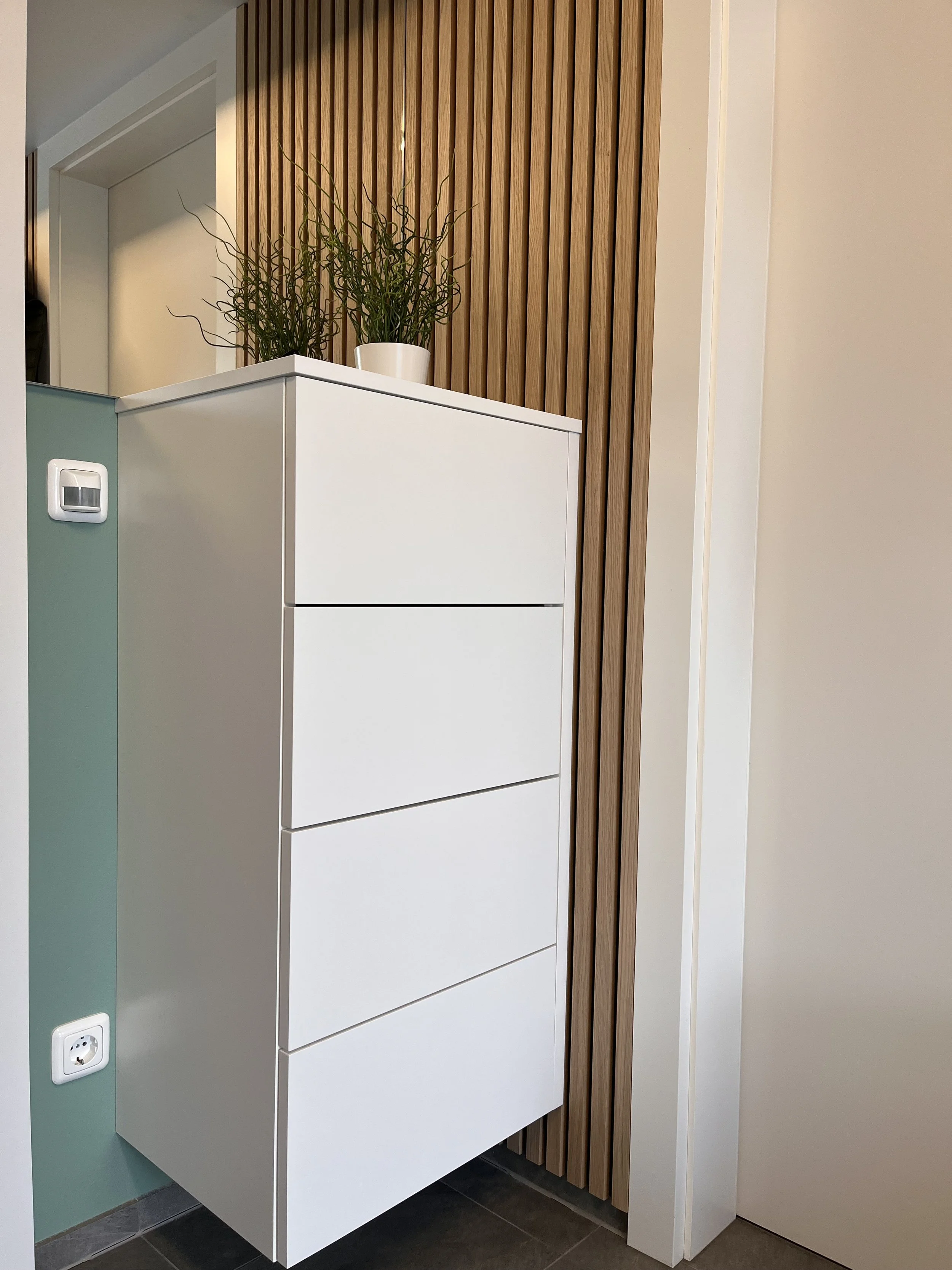 Mit dem schlichten Design wurde eine angenehm ruhige Atmosphäre auf den kleinen Raum geschaffen. Trotzdem war Voraussetzung so viel Stauraum wie möglich zu erzielen.